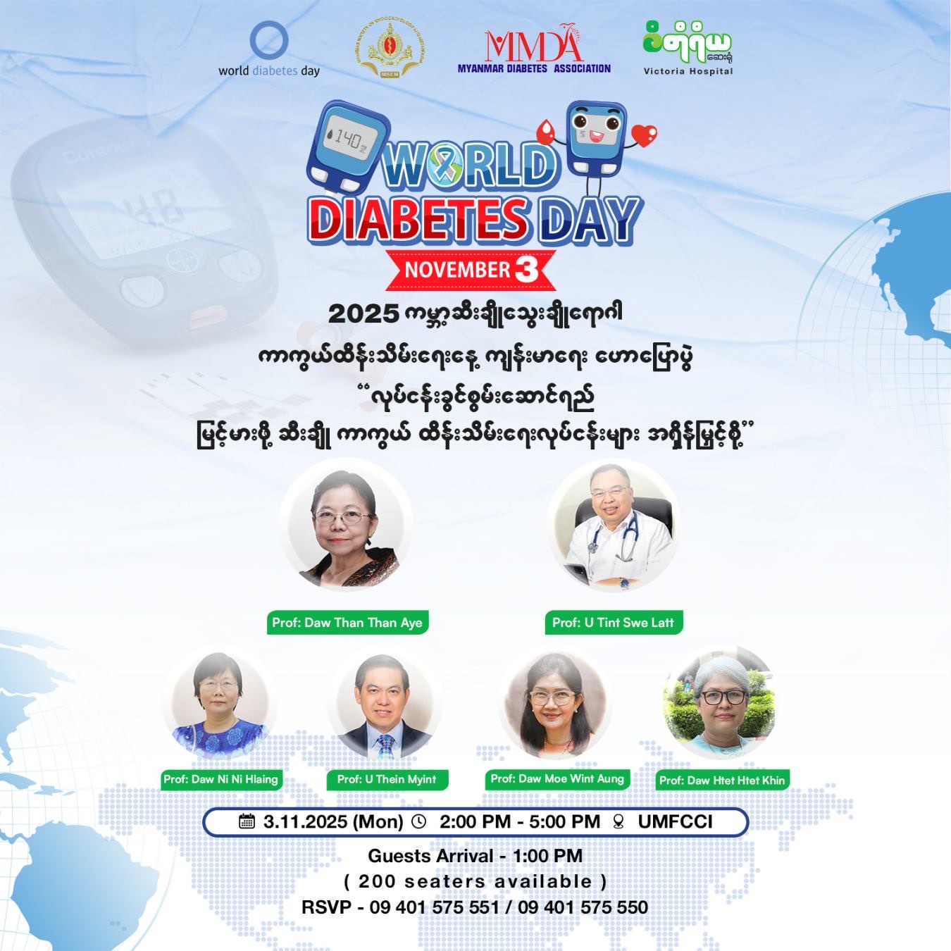 📌 “ကမ္ဘာ့ဆီးချို၊ သွေးချိုရောဂါ ကာကွယ်ထိန်းသိမ်းရေးနေ့” အထိမ်းအမှတ်အဖြစ် မြန်မာနိုင်ငံဆီးချိုသွေးချိုရောဂါအသင်း (MMDA) နှင့် ဝိတိုရိယဆေးရုံ ( Victoria Hospital) တို့မှ ပူးပေါင်းကျင်းပမည့် ဆီးချိုသွေးချိုနှင့် ဟော်မုန်းဆိုင်ရာ ကျန်းမာရေးအသိပညာပေး ဟောပြောပွဲကြီး